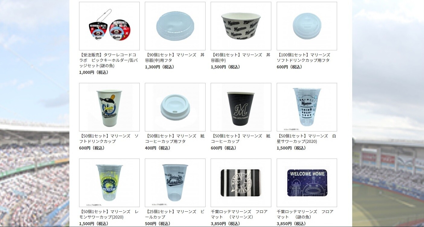 マリーンズの丼容器45個1セット、ソフトドリンクカップ50個1セット、ビールカップ25個1セット、白星サワーカップ(2020)50個1セットなど。