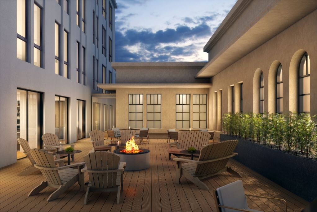 「新築棟」の共用部には、東山の緑豊かな山並みを一望するロビーとレストラン&バー、宿泊者専用のラウンジ&パティオ、フィットネスを併設。屋外のパティオでは、炎の揺らぎや薪の燃える音により癒しの時間を過ごすことができる。