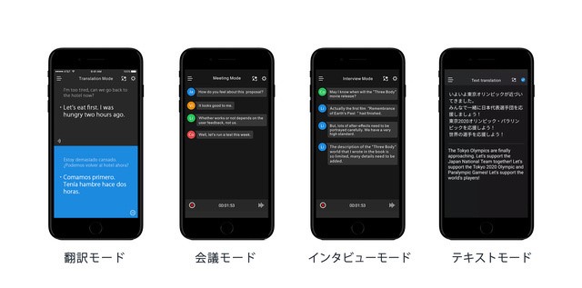「ZERO」は、目的に合わせて使い分けられる4種類のモードを搭載している。93言語に対応した「翻訳モード」、4名までの音声を認識・録音・書き起こしする「会議モード」、 双方の会話をチャット画面のように記録する「インタビューモード」、タイピングした文章を翻訳する「テキストモード」の4種類のモードを備える。(600分まで無料で保存できる)