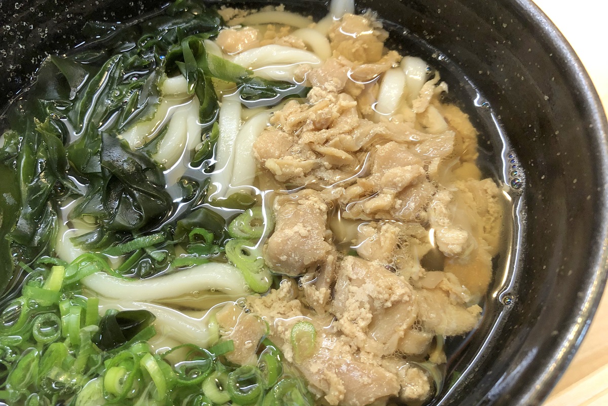 食券を買ってカウンターに立ってしばらく待つと、熱々のかしわうどんが目の前に置かれた。具は、刻みネギとわかめ、そして、鶏のかしわがたっぷりはいっていた。