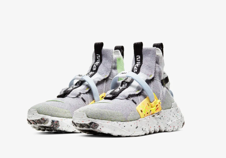 「Space Waste Yarn(宇宙ごみの糸)」と呼ばれるアッパーには、ペットボトル、Tシャツ、糸の廃棄物から生まれたリサイクルポリエステル素材を約85%使用。また、足にぴったりフィットするFastFitシステムの余り部分を使い、着脱を簡単にしている。柔らかいCrater Foamミッドソールには、Nike Grindと複数のフォームの混合物をミックス。優れた安定感を持つユニークなデザインに仕上げている。インソールには、Nikeのネクスト% ランニングシューズで究極の履き心地を生み出すクッショニング、ZoomXフォームの廃棄物を使用している。