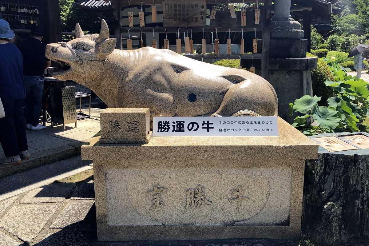 本堂の逆側にあるのが「勝運の牛」で、この手の牛は他の寺社でも見かける。ただ、「牛の口の中にある玉をさわると勝運がつくと伝えられています」とあり、口の中まで手を入れられるのは極めて珍しい。