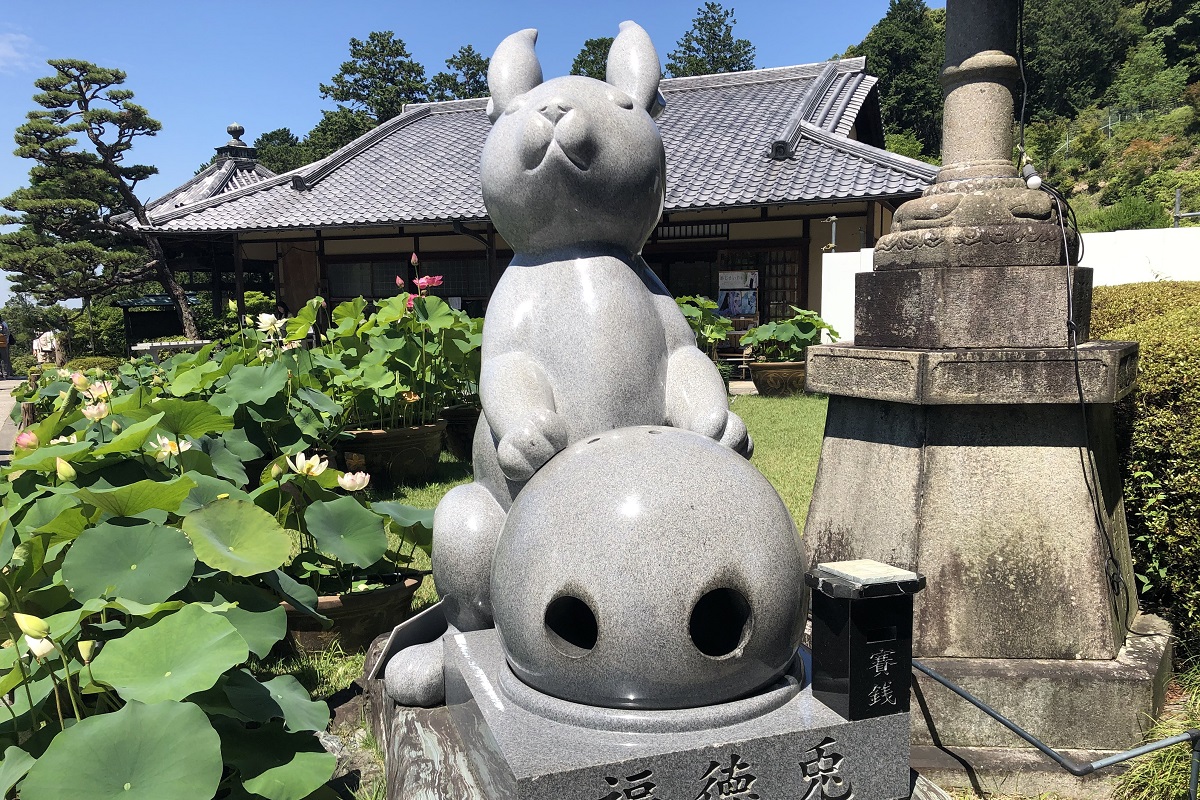 次に、本堂の前に立つ「福徳兎」に遭遇。説明文には「球中の玉子が立てば運気があがり、足腰健全になると伝えられています」とある。これも行列ができるほど人気だった。福徳兎には2つの穴があり、両手を入れて中の玉子を立てるのはなかなか難しい。諸説によると、応神天皇の子が宇治へ初めて来た時、このウサギが案内したという。