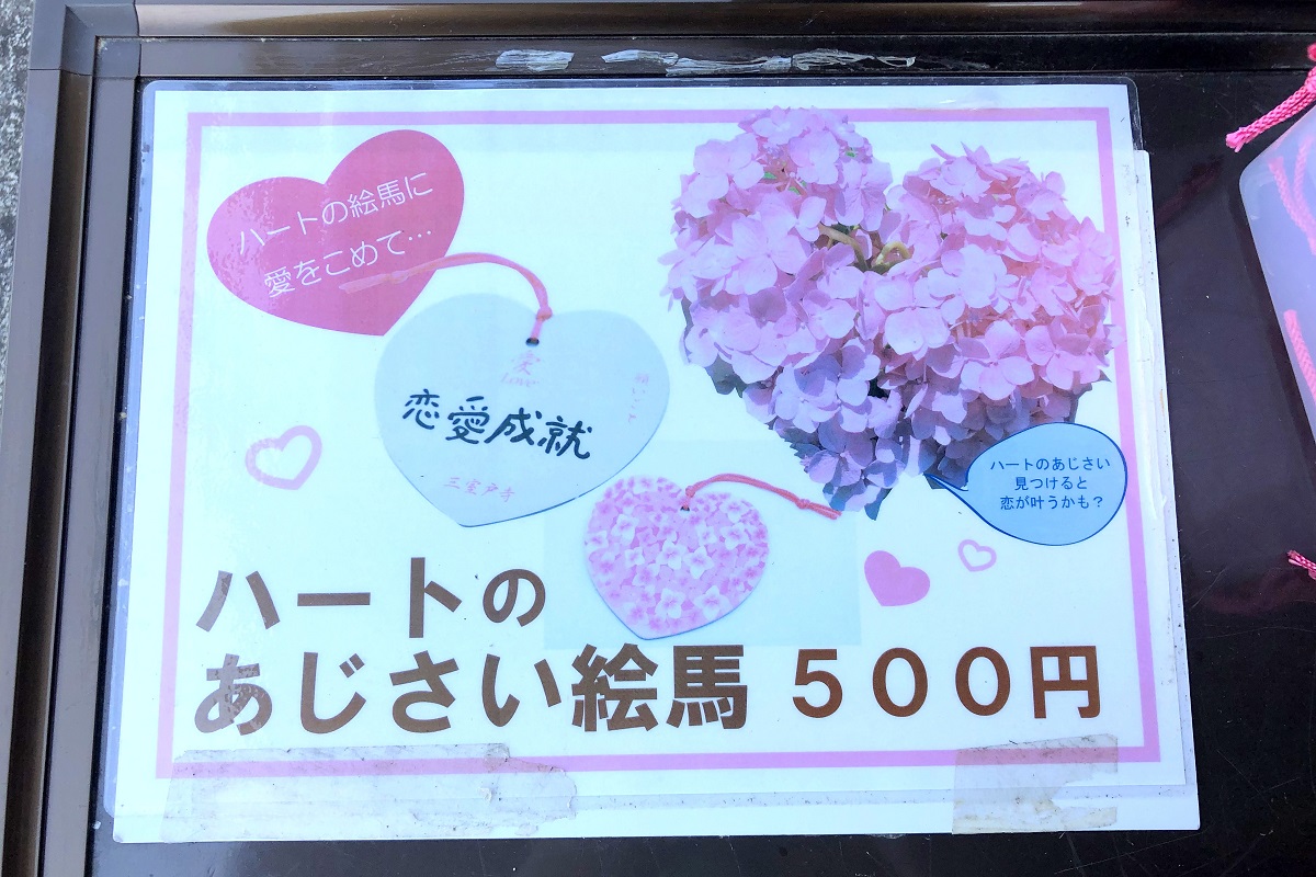 三室戸寺へもし訪れたなら、アジサイ園とともに、ぜひ本堂へお参りして、3つのご利益参りもぜひ。恋愛成就というハート型のあじさい絵馬もおすすめ。