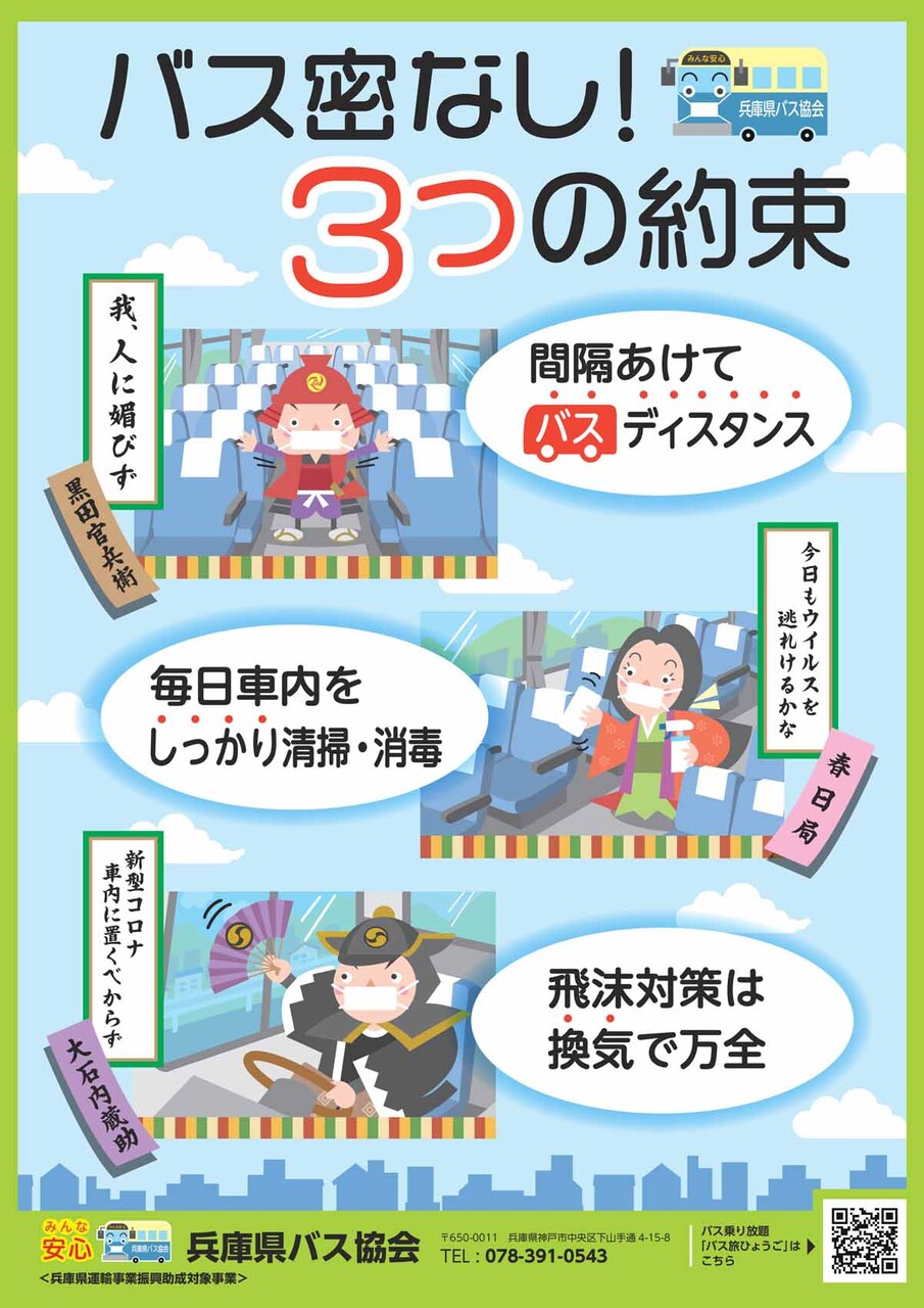 このキャンペーンは、バスにおける対策として「間隔をあけて“バス”ディスタンス」「毎日車内を“しっかり”清掃・消毒」「飛沫対策は“換気”で万全」をアピール。それぞれの約束に対し、兵庫にゆかりがある歴史人物「黒田官兵衛」「春日局」「大石内蔵助」の3人をキャラクター化し、各人の名言をもとにわかりやすく表現しているのが特徴だ。