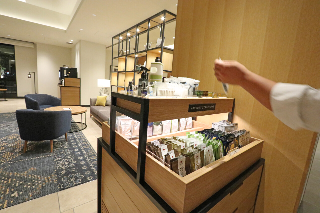 フロントロビーには、お好みで入浴剤や化粧水、洗顔料、カミソリ、綿棒といったアメニティグッズを自由に選べる「アメニティステーション」が設置されている。