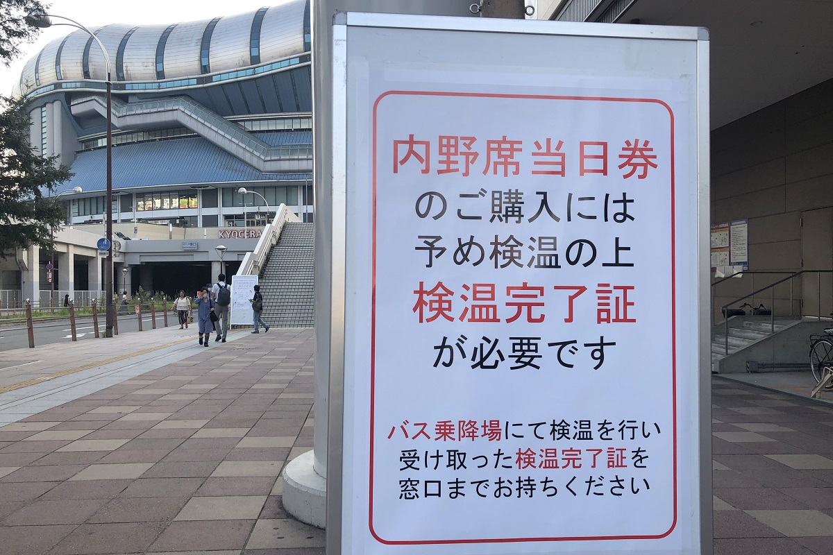 京セラドーム大阪の場合、内野席がバス降車場で、外野席はゲート入口でそれぞれ検温を受ける。どちらの座席でも体験したところ、内野席はまるで流れ作業の如くすぐ終わり、外野席は1人1人検温していて時間がややかかった。
