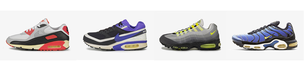 大きなウィンド。前足部のエア。フルレングス エア。チューンド エア。90年代、その時代背景を反映しながら、エアの構造や外見も大きく変更し、エアに“マックス”の名もつくようになりました。