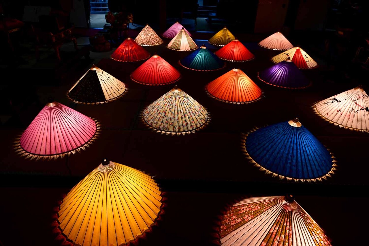 本堂内に並べられているカラフルな和傘のライトアップは最近、SNS映えとして人気という。誰でも撮影可能で、ぜひ記念に撮ってみてほしい。