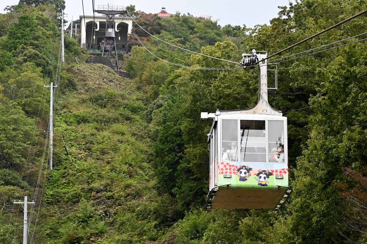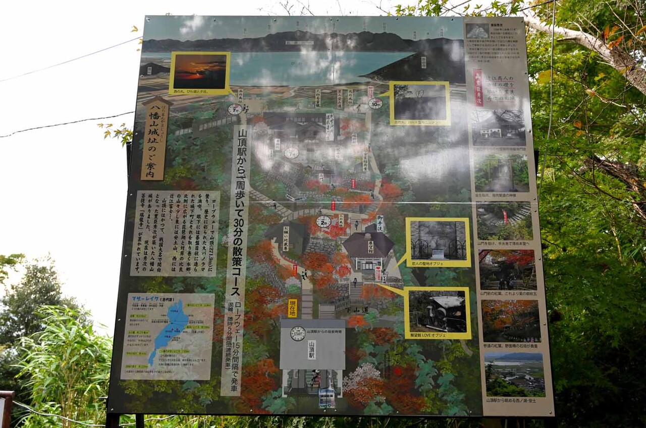 その秀次は生前、標高271.9mの八幡山山頂部に城を作った。八幡山には現在、ロープウェーに乗り、山ろくからたった4分で行くことできる。ロープウェーは年中無休で、四季折々の眺めが楽しめる。