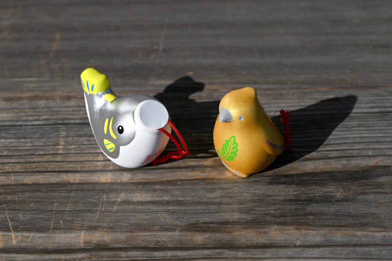 「金鵄(きんし)みくじ」は、日本建国の伝承において神武天皇を豪族との戦いで勝利に導いた幸運のトビがモチーフ。一方「鮎みくじ」は、神武天皇が勝敗を魚(鮎)で占ったと伝わることに由来する。