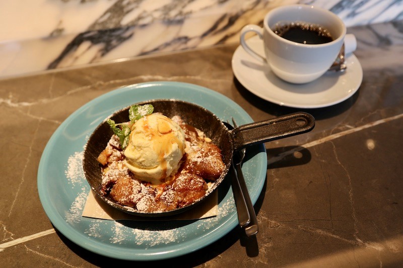 オリジナリティ溢れるスイーツメニューも必見。「キャラメルアップルブレッドプディング」(850円/税込)は、キャラメルソースで煮込んだりんごとバニラアイスを添えた見た目華やかな一品。熱々のリンゴと冷んやりアイスのコントラストも格別だ。