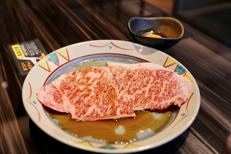 イチオシはキメ細かい部位を使用した「焼きすきサーロイン」。赤身が残る程度にサッと炙り、特製の月見ダレに絡めていただく。口の中で広がる濃厚な旨味は贅沢そのものだ。