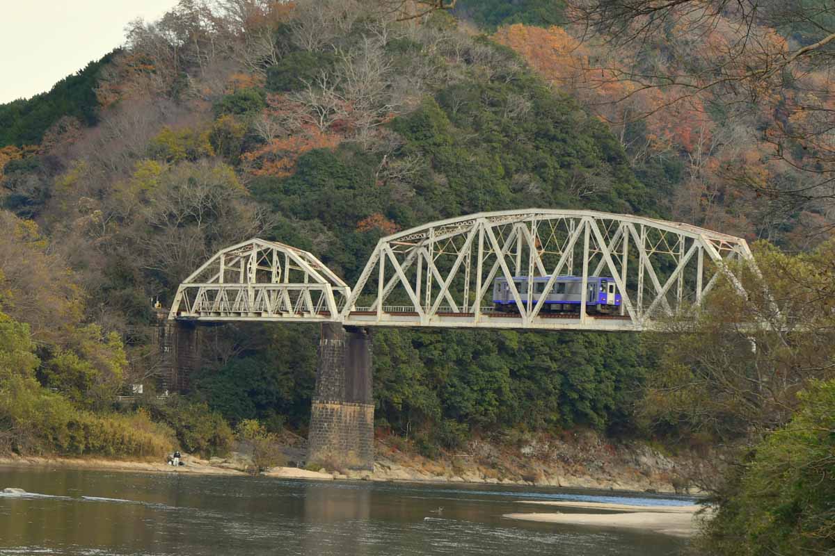 関西本線の亀山〜加茂で、電車の本数は日中、上下それぞれ1時間に1本。車両は1両(2両の場合もある)で、非電化区間かつ、電線などの人工物がとても少ない上、山と川という自然の中を走る光景は、ローカルな鉄道写真そのもの。