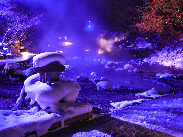 ちなみに、湯畑と同様、夜にはライトアップが行われる。溶岩石が転がり、温泉の湯だまりが点在する不思議な風景が光に照らされて、異世界に迷いこんだような雰囲気が味わえる。