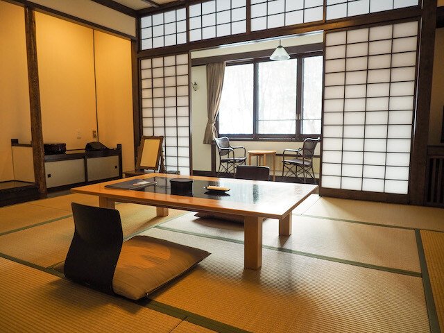 通していただいた部屋は、室内に廊下が付いていてゆったりとした贅沢な作り。10畳の和室の奥にはカフェテーブルもあり、窓の外を眺めながら一息つける。