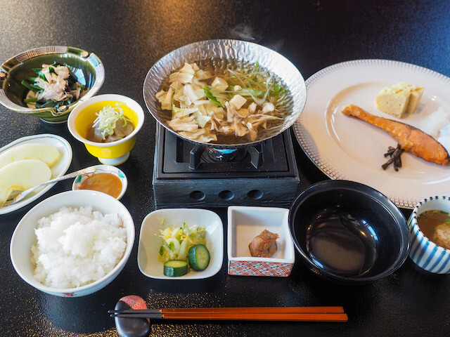 朝食も食事処「奥庭」でいただく。お鍋仕立てのお味噌汁、鮭、卵焼き、小付などたっぷりのメニューで、朝からエネルギーチャージできた。