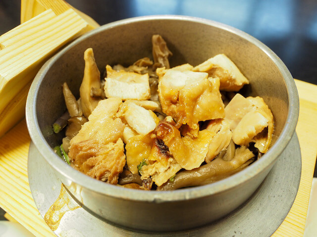 この日のおすすめNo.1メニュー、六合産の舞茸と赤城鶏を炊き込んだ、鳥舞茸山菜釜飯(1760円)をいただいた。しっかりした味付けで、鶏肉、舞茸、山菜がぎっしりと炊き込まれている。釜飯が炊けるまで20分ほど待つが、その価値あり!