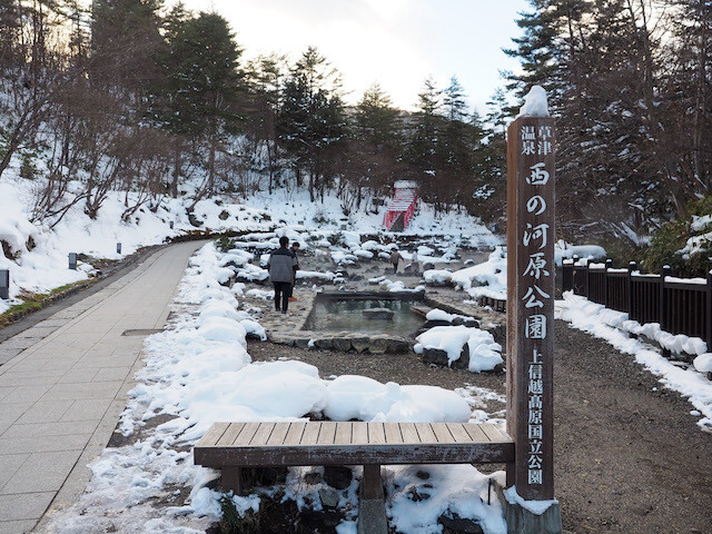 西の河原通りの突き当たりにあるのが、西の河原公園。この一帯は上信越高原国立公園の特別地域に指定されていて、辺り一面至るところから温泉が湧き出している。その地形から、昔は鬼が住む場所といわれており、今でも鬼の茶釜、鬼の相撲場などの名称が残っている。