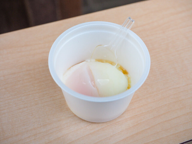 足湯「湯けむり亭」近くの漬物店「頼朝」では、温泉たまごが購入できる。小さなスプーンとタレが付属していて、1つ130円。お店の外にあるカウンターで卵を割り、その場で食べられる。黄身が濃厚な味わいだ。