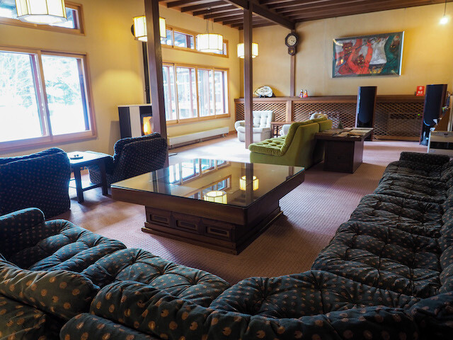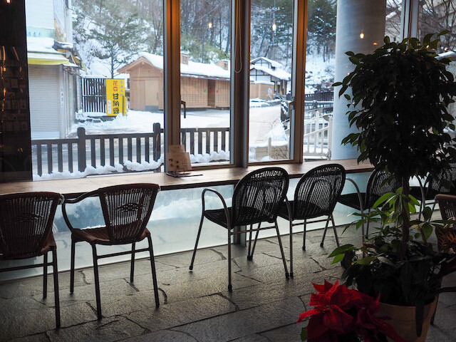 体温を測定し、アルコール消毒をしてチェックインすると、暖炉のある温かな空間が迎えてくれる。雪景色を眺めながら日がな一日のんびりしていたいような、くつろげるラウンジだ。
