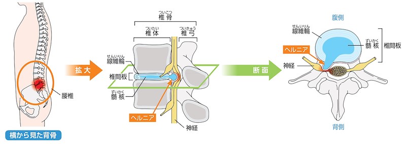 「腰椎椎間板ヘルニア」は腰の椎間板から髄核(ずいかく)が飛び出し、近くにある神経を圧迫した結果、足の痛みや痺れが生じるというもの。髄核は20歳代から、繊維輪は30歳代から老化が始まるといわれており、日常的に酷使することによって椎間板は消耗する。それゆえ椎間板ヘルニアには20〜40歳代が比較的かかりやすく、さらに男性は女性と比較し2〜3倍多い。また重労働や激しいスポーツ、長時間のデスクワークを仕事とする人がかかりやすい傾向にある。