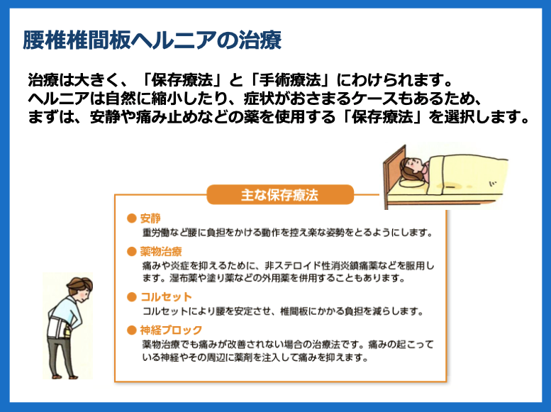 これまでのヘルニア治療は長期「保存療法」と「手術療法」に分けられていた。ヘルニアは自然に症状が改善されることもあるため、薬を使用する「保存療法」が一般的であった。「手術療法」では術後約7日で退院可能なラブ法と、4〜5日間の入院で済む内鏡下椎間板摘出術(MED法)が代表的なものであった。