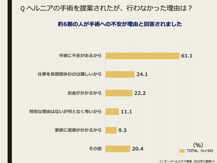 「ヘルニアの手術を医師から提案されたが、行わなかった」という理由においては約6割が「手術への不安があった」と回答。また「仕事を長期間休むのは難しいから」「お金がかかるから」という回答も目立った。