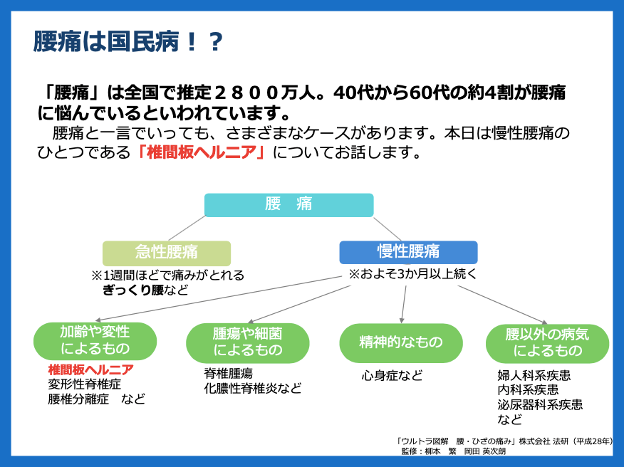 「腰痛」で悩む人は全国で推定2800万人に上ると言われており、40代から60代においては約4割が腰痛に悩んでいると言われている。一方で腰痛には実にさまざまな症状があり、その中の加齢や変性によるものが「椎間板ヘルニア」となる。