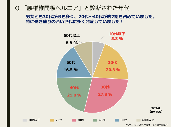 セミナー後半では生化学工業が行ったアンケート調査をもとにしたトークセッションが開催された。「腰椎椎間板ヘルニア」と診断されたことがある男女400名にアンケート調査を実施したところ、診断された年代においては男女とも30代が最も多く、20代〜40代が約7割を占めていた。