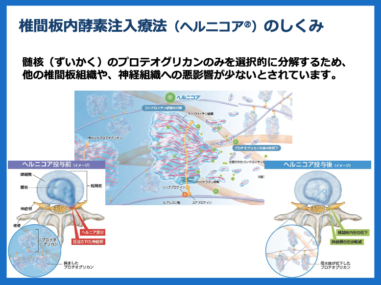 これまで保存療法か手術という2択のみだったヘルニア治療の新たな選択肢として登場したのが、生化学工業が開発し2018年から保険適用された「ヘルニコアR」だ。これは椎間板に酵素を含んだ薬剤「ヘルニコアR」を直接注射し、ヘルニアによる神経の圧迫を弱めるという治療法だ。通常髄核は水分を含んで膨らんだ状態にあるが、「ヘルニコアR」を注入することで酵素の力で髄核内の保水成分が分解され、神経への圧迫が改善して痛みや痺れを軽減させることができる。