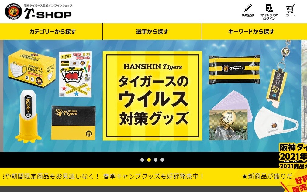 昨年から各球団とも急に増えた、ウイルス対策グッズ。阪神では特設バナーからアクセスすると、マウスカバー、マスクバンド、紙せっけん、マスクバッグ、ウェットティッシュなどの商品が並ぶ。その数なんと60種類以上。特にマスクカバーの種類が豊富なので、お気に入りをぜひ見つけてほしい。