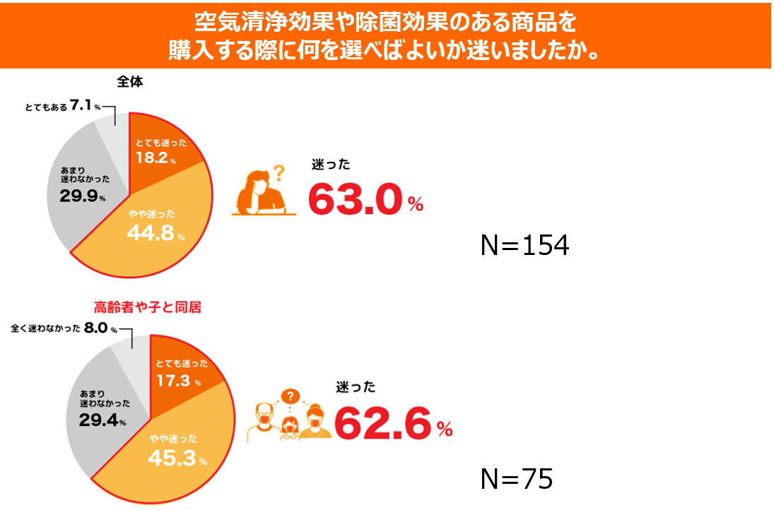 まず、家庭内で感染対策を行っていると回答した人のうち「自信がない」との回答が半数以上。特に、子どもや高齢者との同居者に限定するとさらに多い約65%に上った。全体的にいまだ家庭での感染対策に不安を抱く人が多いのが伺える。