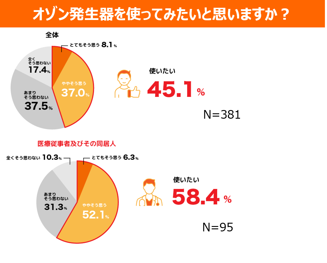 「オゾン発生器」を使ったことがない人のうち、オゾンの除菌効果を試してみたいとの回答が約45%、特に、医療従事者とその同居人に限定すると約60%が試してみたいと回答した。オゾンには、除菌、消臭、カビ防止、害虫忌避などさまざまな効果が期待できるものの、一般的な認知度はまだ低い。