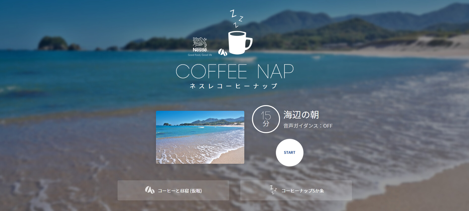 ネスレは、睡眠の専門家監修コンテンツ「ネスレ コーヒーナップ」をWeb公開中。15分程度の短い昼寝を画像と音でサポートするコンテンツで、音声ガイダンスで昼寝のコツを知らせるほか、時間に応じて音が変化して心地よい目覚めをサポートする。“コーヒーナップ”5か条も、ぜひチェックしてほしい。