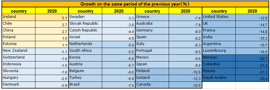 OCEDの統計を見てみると、主要43か国のうちなんと13か国が昨年対比で10%以上も輸出額を減少させている。