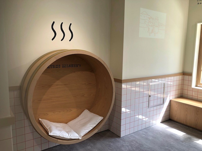 2階のイートインスぺースでは、1階で購入したカフェメニューをゆっくり味わうことができる。大きな桶型のチェアや、熱海温泉の歴史がわかる手書きの壁画イラストなど、熱海温泉ならではの魅力が随所に点在。温泉のお風呂上がり気分を思う存分に楽しめる空間だ。