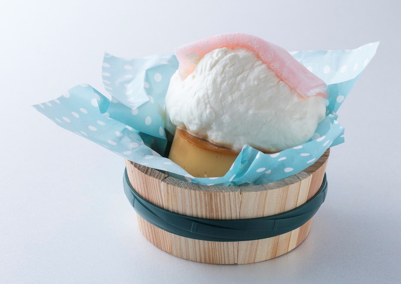 イートイン限定の「桶プリン」(650円)は、桶に入った固めのプリンにチーズクリームをたっぷりトッピング。さらに手ぬぐいに見立てた求肥をあしらい、まるでお風呂に入っているかのようなスイーツに仕立てた。味はもちろん、見た目も楽しめる一品だ。