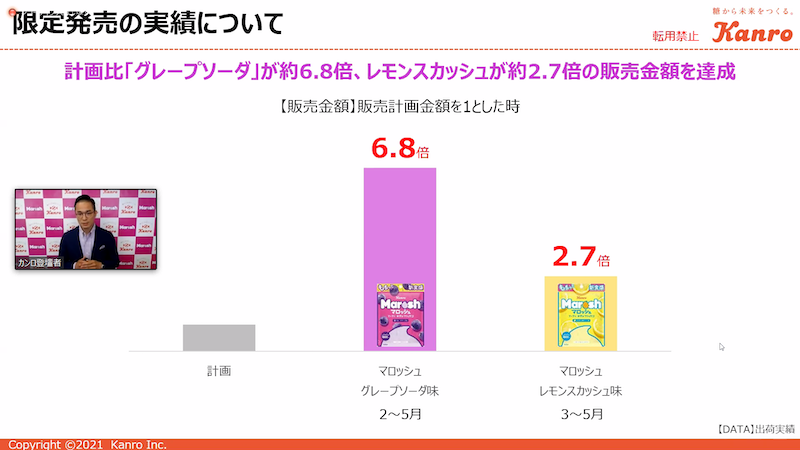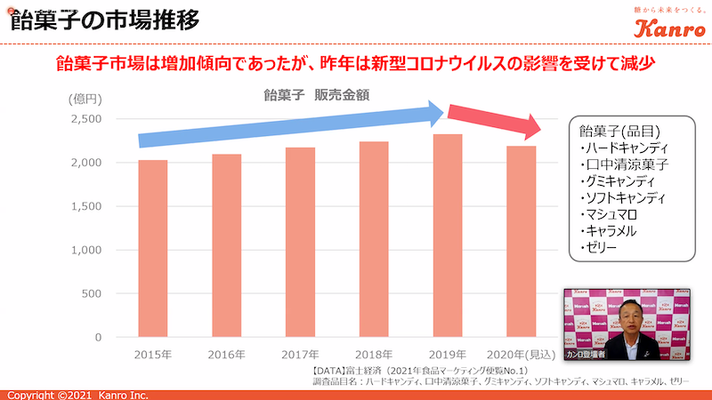前半ではカンロ代表取締役社長の三須和泰氏より、飴菓子の市場動向や新商品「マロッシュ」についての全体戦略が説明された。1912年の創業以来、カンロ飴やピュレグミなどの様々な人気商品を創出してきたカンロ。飴菓子の市場動向においては、グミやタブレットの売り上げ拡大により2019年まで増加傾向にあったが、昨年はコロナ禍の影響を大きく受けた。