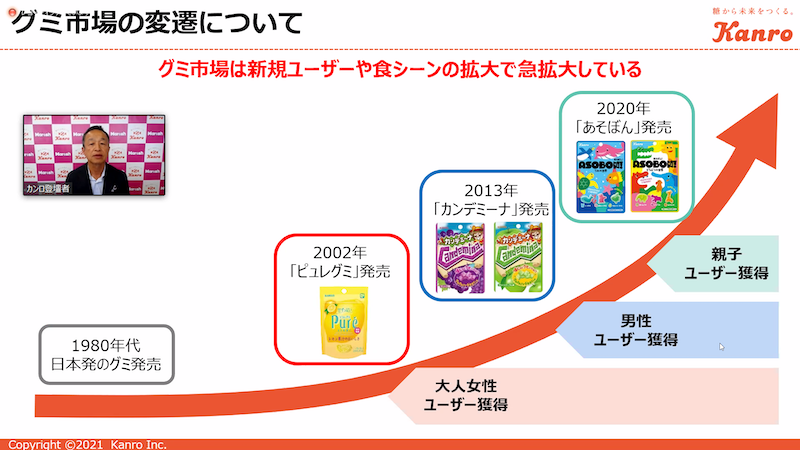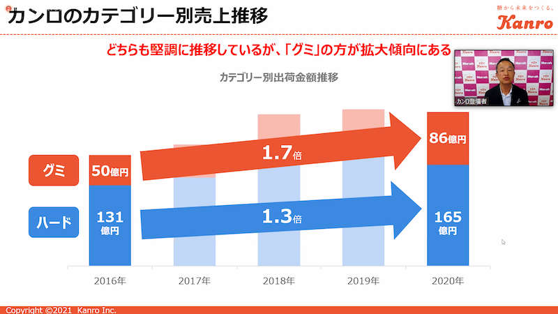 同社の2020年売上構成比では、ハードキャンディーが約6割、グミが約3割であるが、ここ数年注力しているグミについてはこの5年間で1.7倍にまで拡大している。