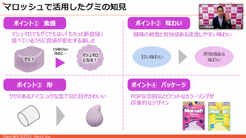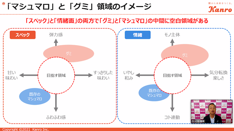 新商品「マロッシュ」は、マシュマロとグミを比較し、それぞれのカテゴリーに情緒、スペックの両面でカバーされない領域があることに着目し、開発を進めてきた。