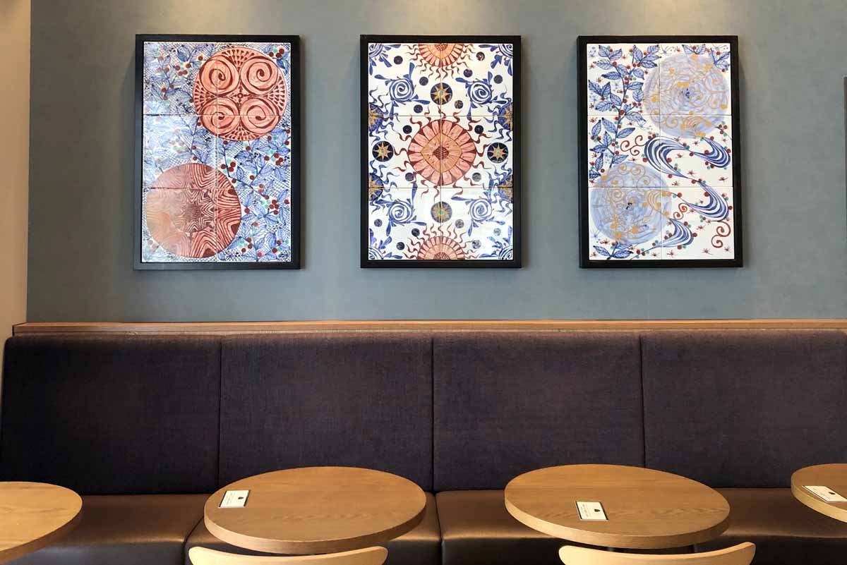 坊っちゃんミュージアムがあった松山市駅前店から徒歩10分ほどの場所にある松山湊町店は、市街地にあるドライブスルー併設店。この店舗の壁に、陶板のアートが飾ってあった。