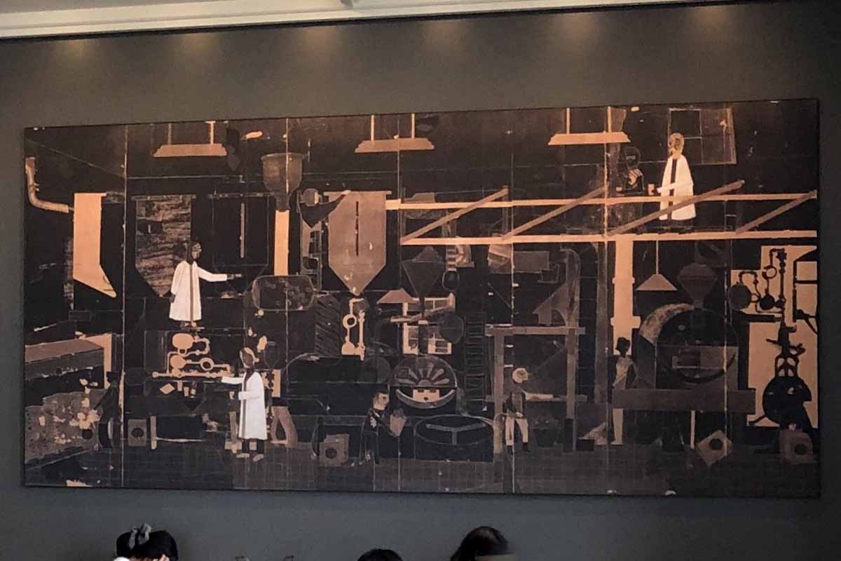 店内に飾られていた巨大アート。コーヒーの焙煎風景だろうか。鉄道の本社であり、鉄道ミュージアムもあることから、ややメカニカルなデザインにも見える。