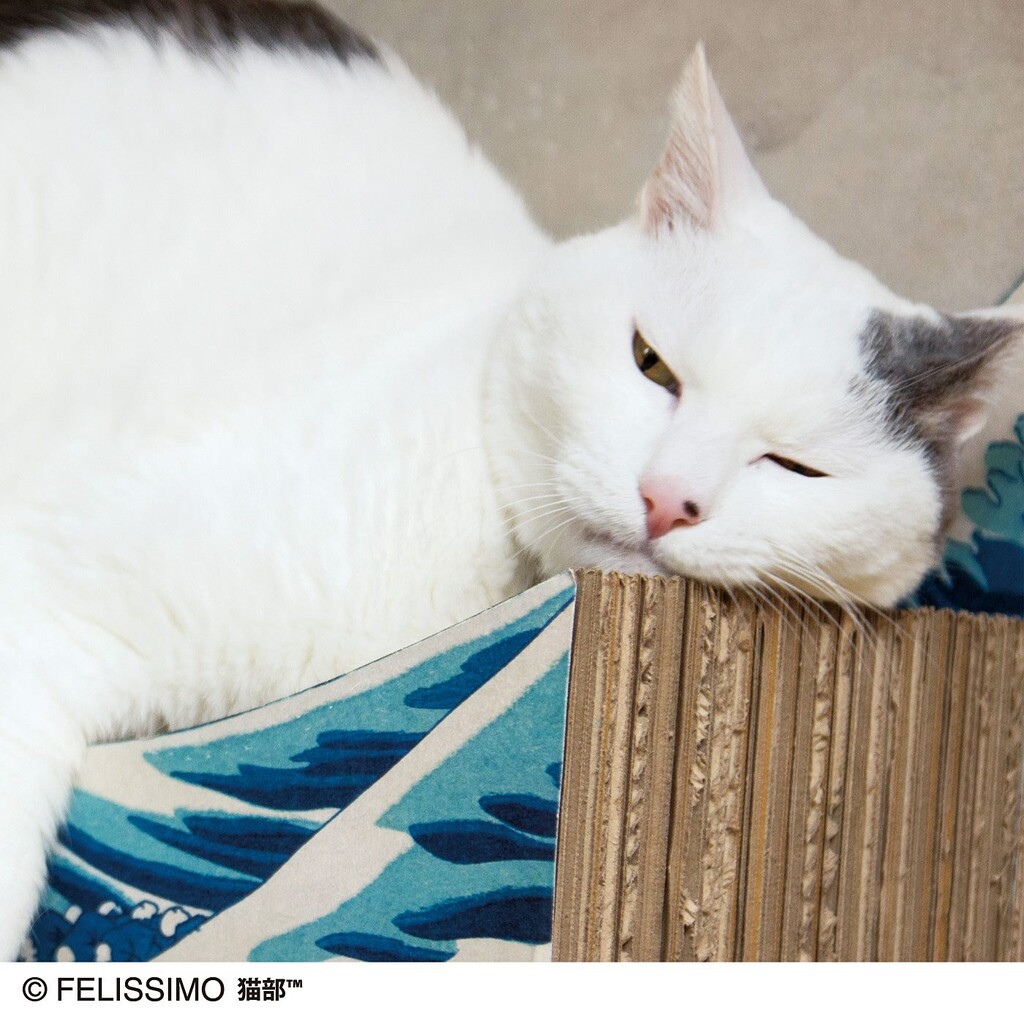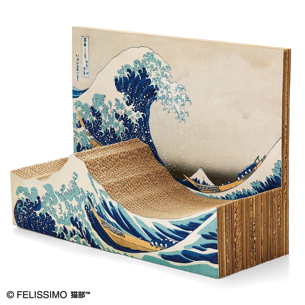 世界的名画 葛飾北斎の「神奈川沖浪裏」が猫さん用のつめとぎになりました。猫部とミュージアム部がコラボして企画したこだわりのデザインです。ダイナミックな波の絶妙なカーブはつめをとぎやすいのはもちろん、くつろぎベッドにも◎。愛猫が波とたわむれる&くつろぐ姿はSNS映え間違いなし!