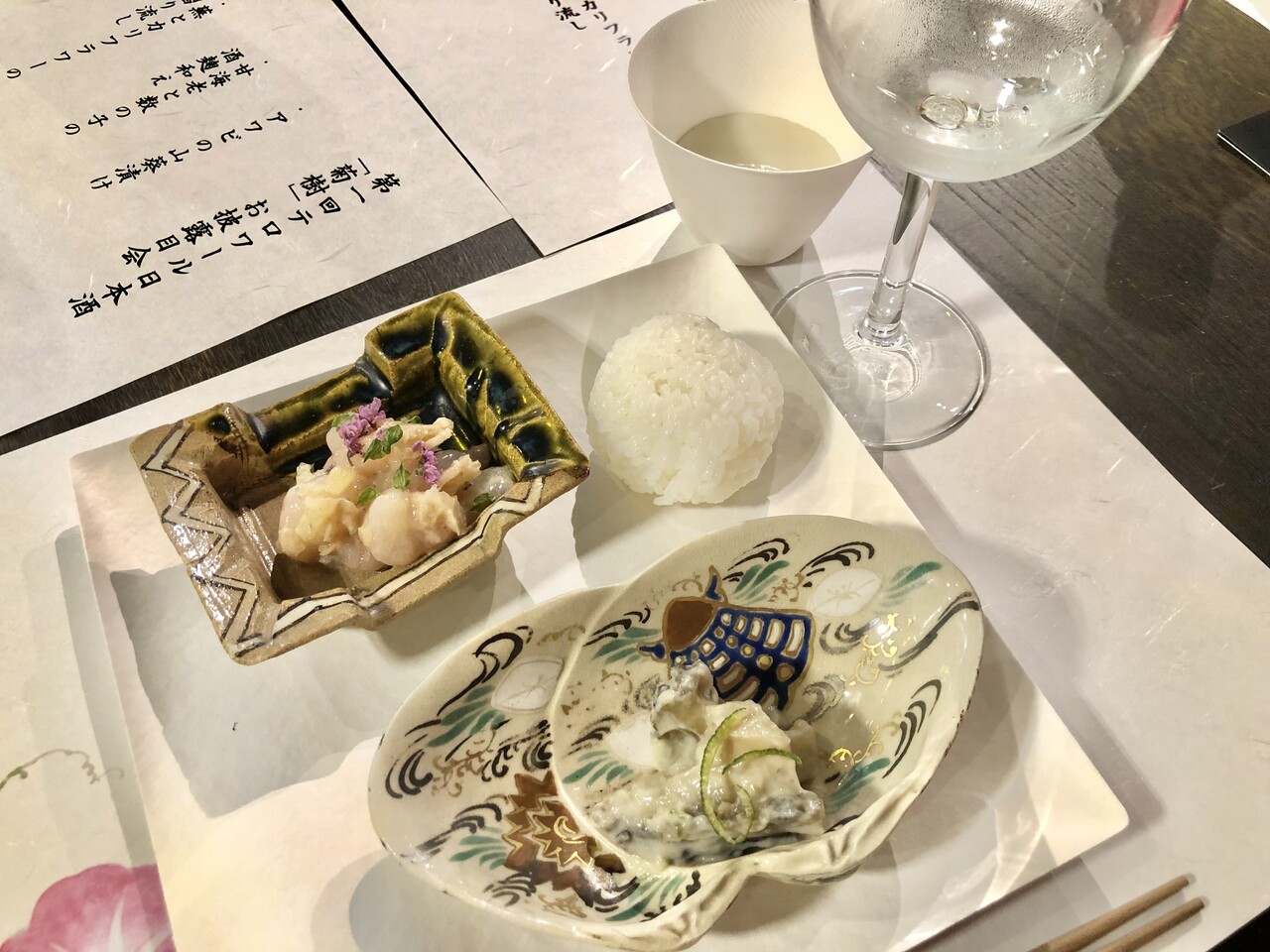 さっそく冷酒から味わってみたが、最初の一口目からとろりとまろやか、これは女酒!そして愛媛酵母のもたらす穏やかな香り。大吟醸とはいえ、けっして派手ではなく、しっとり上品さが漂っている。提供された「蕪とカリフラワーの摺り流し」のなめらかなテクスチャーや野菜の旨味にとてもよく合い、出だしから非常に美味しい。