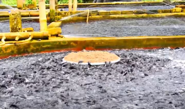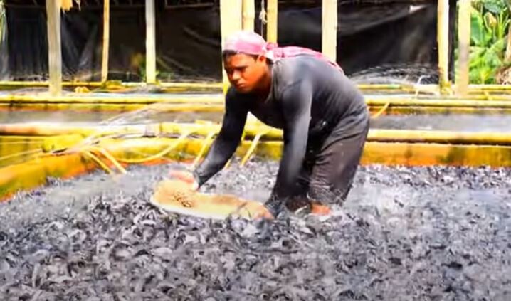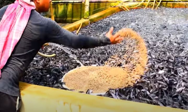 インド・西ベンガル州のナマズ養殖場の様子。一つの水槽で何百万匹ものナマズを飼育している。スタッフが大きなバケツに飼料を出し、こんもり盛られた餌をナマズ水槽の上に置いた瞬間、数百匹のナマズが餌の入ったバケツに押し寄せる。さらにスタッフ自らが水槽に入り、バケツから餌を振り撒き出すと、数百匹のナマズが大熱狂。毎回大盛り上がりの餌やり業務。効率は良さそうだが、いくら何でもやりすぎである。