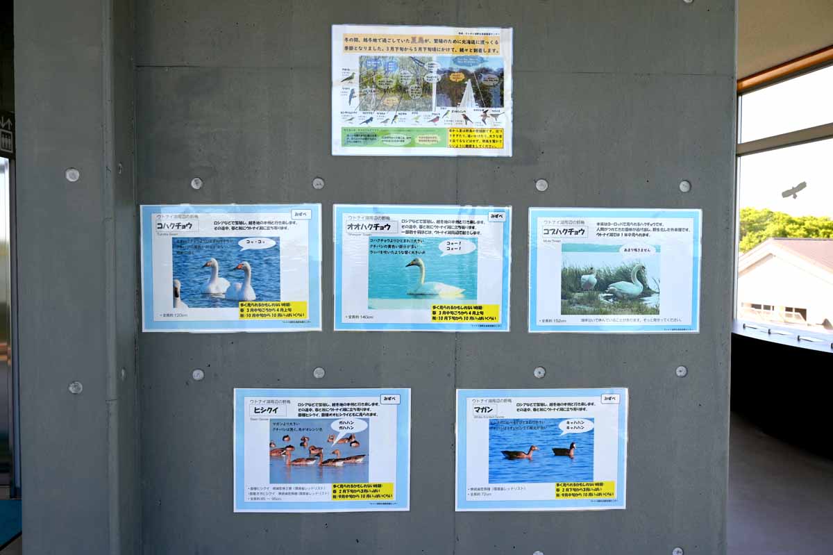 ウトナイ湖のそばにそびえる、湖が一望できる展望施設は、2019年3月に完成。エレベーターがあるものの、あいにく故障中とのことで、3階分を階段で登ったが、上から眺める湖はとても見る価値があった。途中には、野鳥の紹介コーナーも。天気が良ければぜひ登ってみてほしい。