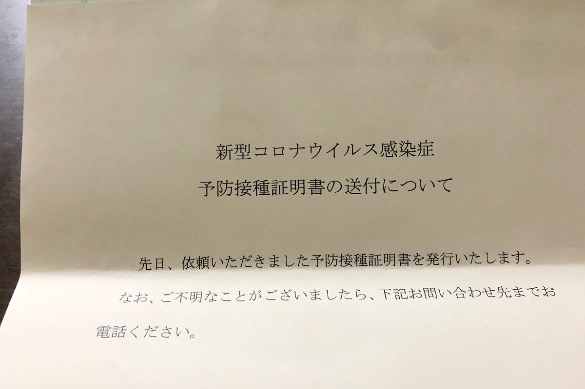 封を開くと、住民票などと同じ用紙に印刷された予防接種証明書(ワクチンパスポート)が入っていた。微々たる郵送料と申請書類の記入やコピーといった手間はかかったものの、スムーズに手に入った。およそ10万人規模の市で、首都圏などよりも海外渡航予定の人が少なかったからかもしれない。