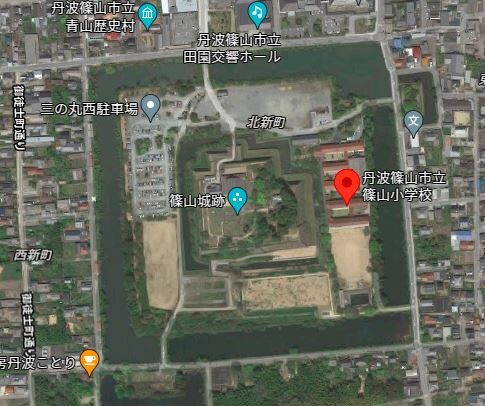 徳川家康が約8万人を動員して築いた名城!篠山城跡の内堀と外堀の間に歴史ある校舎を発見!