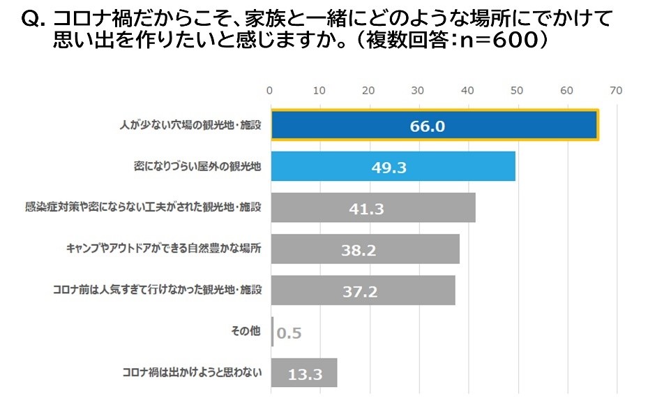 「コロナ禍だからこそ、家族と一緒にどのような場所に出かけて思い出を作りたいか」に対しては、66.0%の親が「人が少ない穴場の観光地・施設」と回答しました。感染者数が減ってきているとはいえ、大事な家族とのおでかけではまだまだ密を避けた穴場スポットの人気が続きそうです。